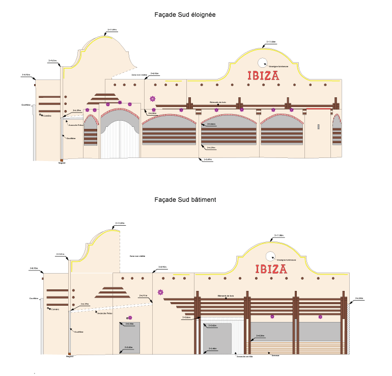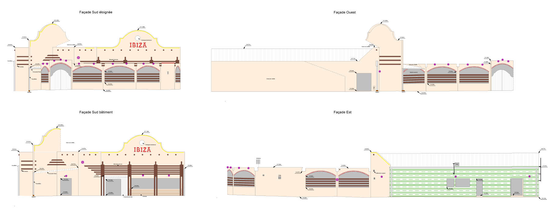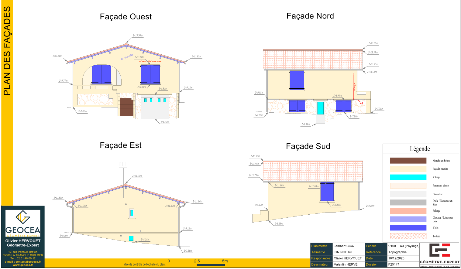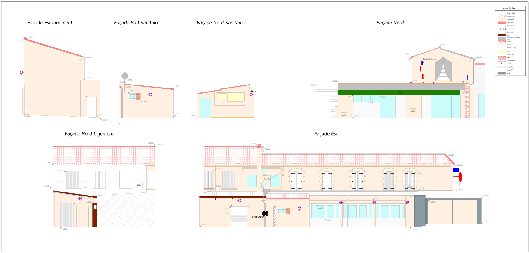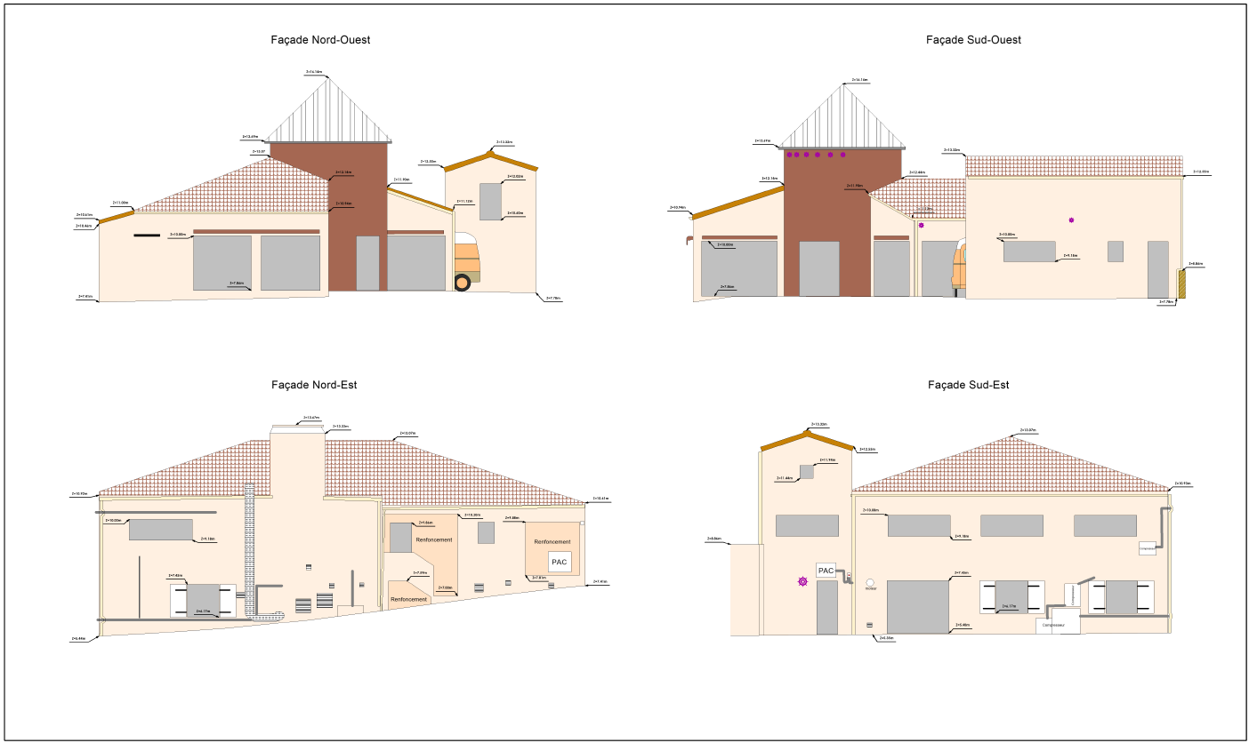 Le processus suit une méthodologie rigoureuse : acquisition sur site par nuage de points 3D, recalage des stations en planimétrie Lambert CC47 et altimétrie IGN NGF 69, puis extraction et mise en plan de chaque façade (Nord, Sud, Est, Ouest et orientations intermédiaires) aux échelles 1/100 ou 1/200. Les plans produits intègrent l’ensemble des détails architecturaux — modénatures, appuis de fenêtres, corniches, descentes EP, coffrets de réseaux, équipements techniques (PAC, enrouleurs) — ainsi qu’une légende normalisée des matériaux et finitions (enduit, bois, tuile, bac acier, menuiseries).